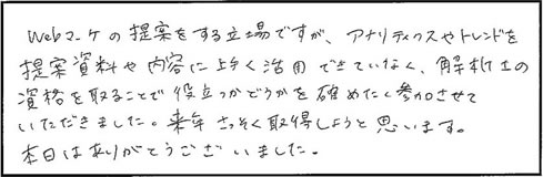 ●Webマーケの提案をする立場ですが、アナリティクスやトレンドを提案資料や内容に上手く活用できていなく、解析士の資格を取ることで役立つかどうかを確かめたく参加させていただきました。来年さっそく取得しようと思います。本日はありがとうございました。
