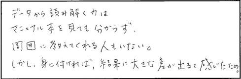●データから読み解く力はマニュアル本を見ても分からず、周囲に教えてくれる人もいない。しかし、身に付ければ、結果に大きな差が出ると感じたため。
