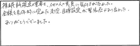 ●複眼的視点の重要さ、他の人の意見に気づきが多かった。金額を具体的に定めた測定、目標設定が緊張感があり良かった。ありがとうございました。