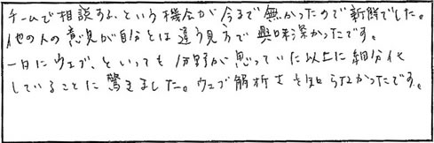 ●チームで相談するという機会が今まで無かったので新鮮でした。他の人の意見が自分とは違う見方で興味深かったです。一口にウェブといっても分野が思っていた以上に細分化していることに驚きました。ウェブ解析士を知らなかったです。