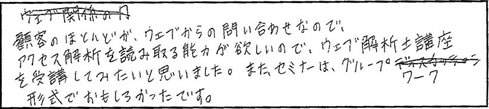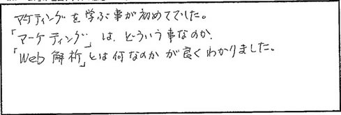 ●マーケティングを学ぶ事が初めてでした。「マーケティング」は、どういう事なのか、「Web解析」とは何なのかが良くわかりました。